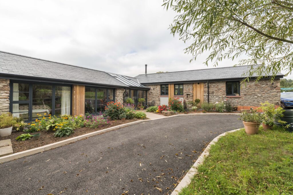 Planning permission was gained to convert the former stone barn into a modern dwelling, including an ecological friendly ground source heat pump with photovoltaic array recessed into the roof finish.