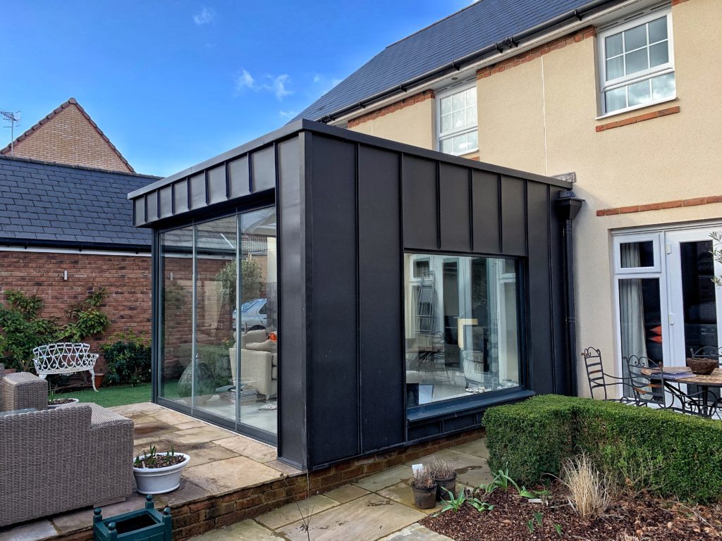 A lightweight Sun Room was added to this modern house on the outskirts of Abergavenny providing extended living space. South facing glazing, frameless bi-fold doors and a central roof light flood the space with natural light whilst masonry north facing walls are clad with a standing seam metal finish.